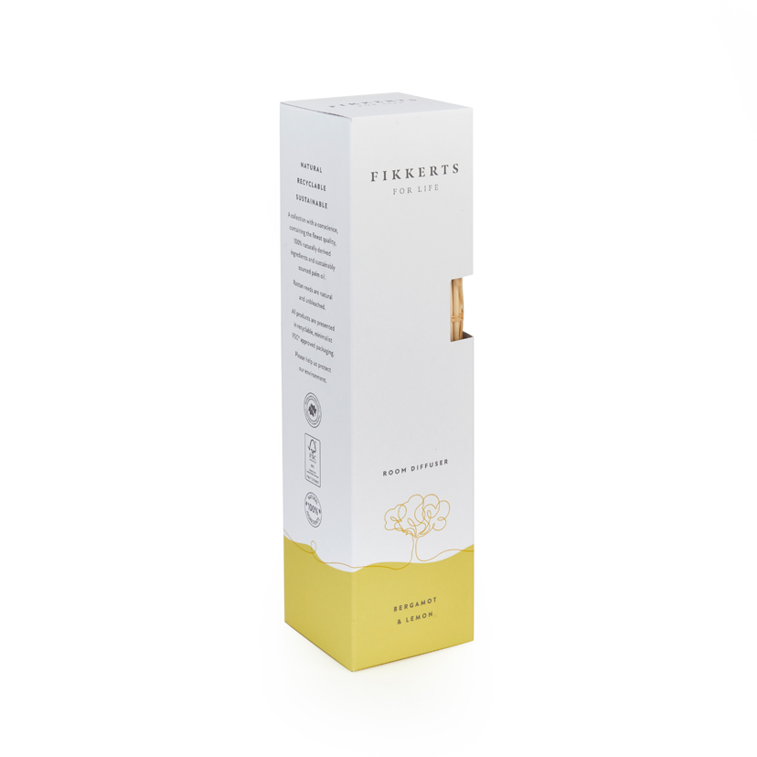 The glass bottle is 100% recyclable, the box is made from FSC-approved and the reeds are tied using recyclable twine.