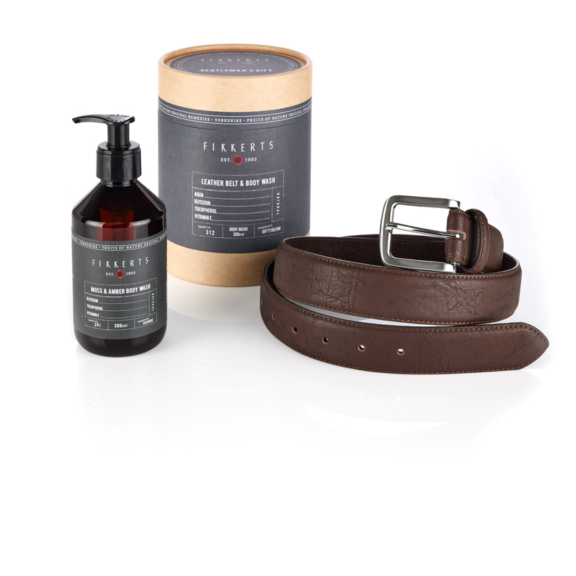 A classy gift box containing a luxury leather belt and a fabulous smelling body wash.