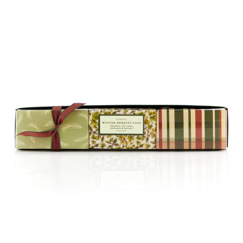 A trio of seasonally wrapped soaps. Pure vegetable-based, triple-milled bars that last a long time and create a lovely smooth lather.